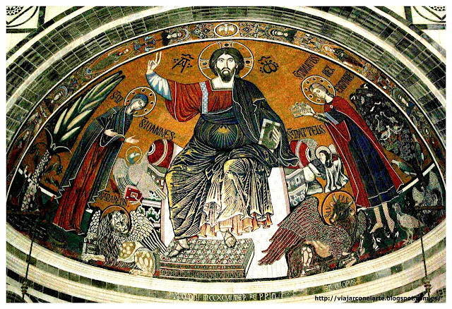 La semicúpula de ábside cuenta con un impresionante mosaico de 1297 de estilo bizantino con el Pantocrátor concediendo la Gloria Celestial a San Miniato, que aparece con el título de “Rex Erminie”, rey de Armenia, representado, con la misma categoría que la Madre de Dios, en el acto de entregar su corona terrenal al verdadero Rey.