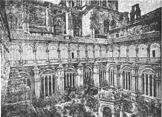 Claustro de los reyes. Grabado de G. A. Gusman, poco posterior a 1864. Para esta fecha ya estaban los cristales en la galería alta, acondicionada como sala del Museo Provincial de Bellas Artes (2)