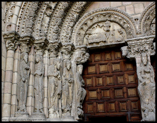 Las arquivoltas apoyan sobre semicolumnas con diez figuras adosadas y capiteles con decoración vegetal salvo en los de los extremos, el de la izquierda con bestias y el de la derecha, muy deteriorado, con lo que parece la representación de un asno con una lira, alegoría del iletrado, del inculto que no entiende lo que oye y también como animal lujurioso y disoluto, colocados en la salida de la iglesia como aviso a los fieles para que después de su purificación tras los ritos litúrgicos, no cayeran de nuevo en la ignorancia y la lujuria.