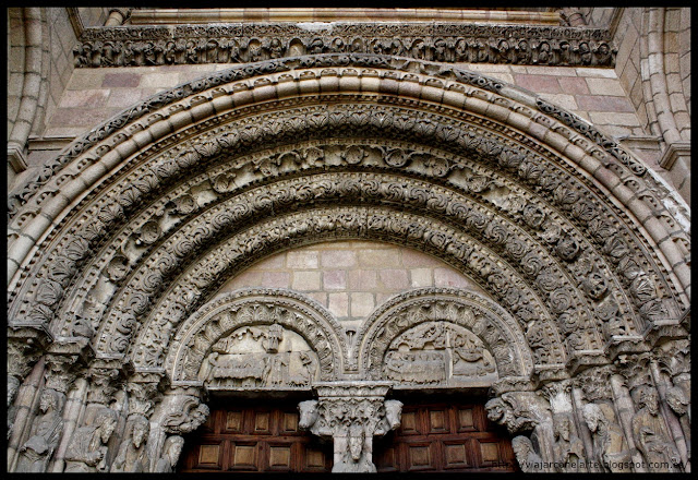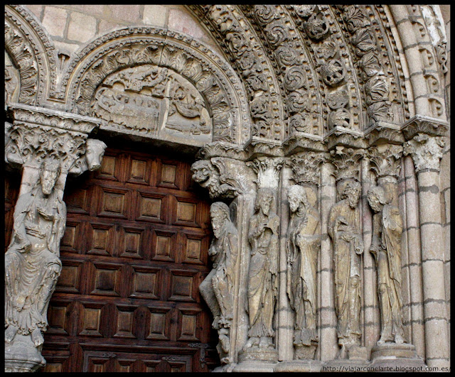 La portada se organiza mediante arco de medio punto de cinco arquivoltas ricamente decoradas, la primera con grifos, centauros, sirenas, basiliscos, arpías... entre una maraña vegetal que parte de una monstruosa cara en la clave; la segunda con hojas enroscadas helicoidalmente; la tercera con flores caladas; en la cuarta aparecen palmetas enroscadas; y la quinta es un grueso baquetón con arquillos que cobijan un par de esferas cada uno.