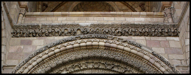 Detalle de la decoración de las arquivoltas, con una figura monstruosa en la clave de la primera