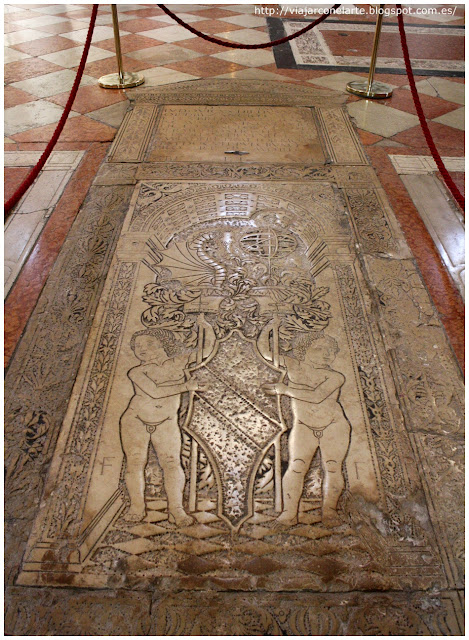 Y terminamos esta primera entrada sobre los monumentos fúnebres de la Basilica dei Santi Giovanni e Paolo con el impresionante presbiterio. Ante su primer escalón se encuentran las tumbas de diez obispos dominicos que vivieron en el convento, y la segunda a la izquierda de la primera fila es la de fray Antonio Corner (17 en el plano), que fue quien consagró la iglesia en 1430.