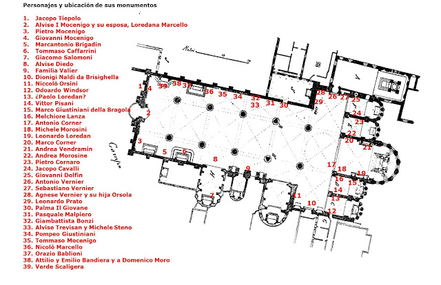 Una vez dentro, ahora nos vamos a ocupar de todos los monumentos funerarios del lado de la Epístola y de las sepulturas de la familia Mocenigo en la contrafachada, dejando los del Evangelio para otro paseo.