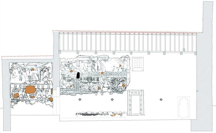 decorada hace intuir que la parte pintada podría haber estado separada físicamente, quizá con un cortinaje, del resto, creando dos ámbitos con funciones litúrgicas distintas. Los cortinajes son propios de todas las religiones