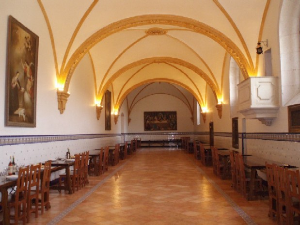 El espacio antes ocupado por la cocina y el comedor medieval fue convertido en refectorio, una gran sala rectangular cubierta con cinco tramos de bóveda de arista con arcos de medio punto y claves con los símbolos del monasterio y de sus abades y con un gran lienzo con la Santa Cena de la escuela romana del siglo XVIII.