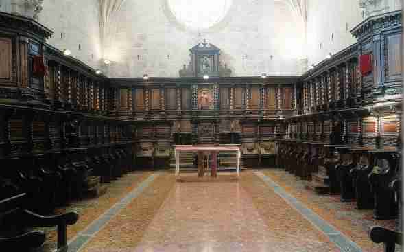 Destaca el coro alto a los pies, que ocupa los dos primeros tramos, con bóvedas de terceletes y gran arco carpanel, y en la que la comunidad agustina actual sigue celebrando la liturgia, con una excelente sillería de nogal de los maestros Antonio y Pedro de Quintana fechada en 1665, con dos pisos en los que se distribuyen 58 sitiales separados por columnas salomónicas y misericordias con motivos florales, zoomórficos y elementos de la heráldica del monasterio. En el respaldo de la silla abacial hay una hornacina con una talla de San Norberto que en 1865 se modificó para que representara a San Agustín.