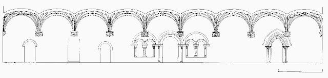Alzado de la panda este del claustro, con los vanos de la sala capitular románica en el centro y portada gótica de la antigua sacristía a la derecha (1 modificada)