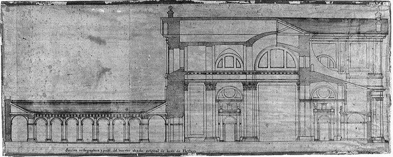 | Sección a la altura del crucero diseñada por Herrera con el claustro a la izquierda, aunque éste tampoco llegó a materializarse (2) |