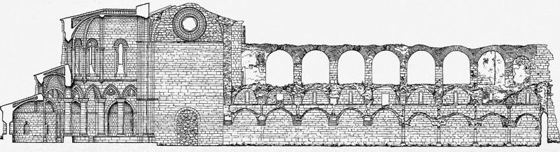 | Alzado de la cabecera de Moreruela. Se indica el nivel al que estaba el suelo antes de las restauraciones de fines del siglo XX (1) |