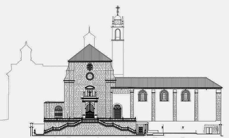 | La iglesia con la escalinata doble de Cristóbal de Vilches que salva el desnivel del terreno |