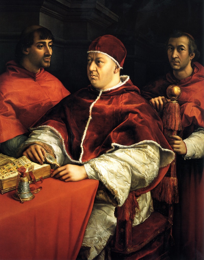 | Retrato de Leone X con sus sobrinos, los cardenales Giulio de' Medici (futuro Clemente VII) y Luigi de' Rossi realizado por Rafael en 1518 conservado en la Galeria degli Uffizi de Florencia (6) |