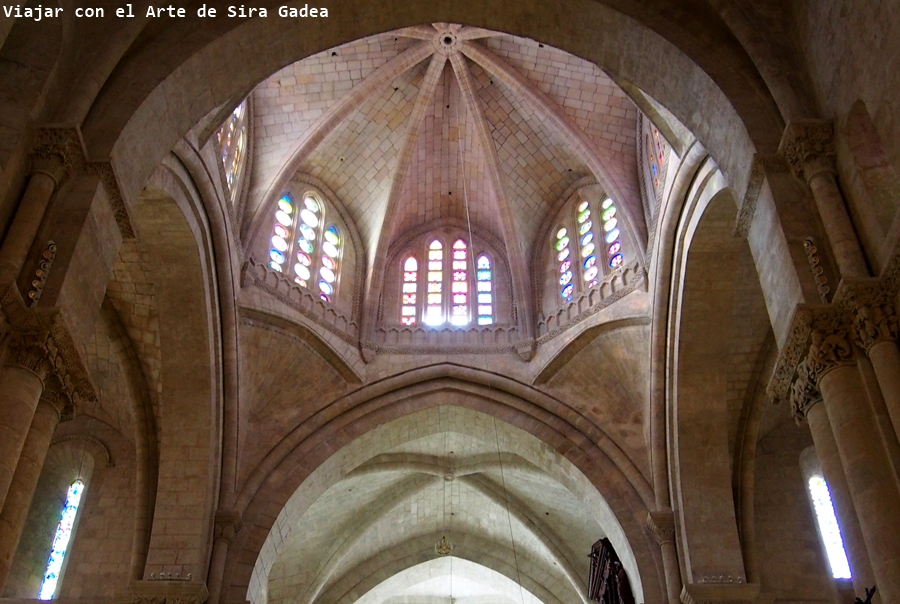 | El presbiterio en la actualidad, con parte de la sillería del coro, un altar contemporáneo en el crucero y el primitivo románico conservado ante el retablo mayor |